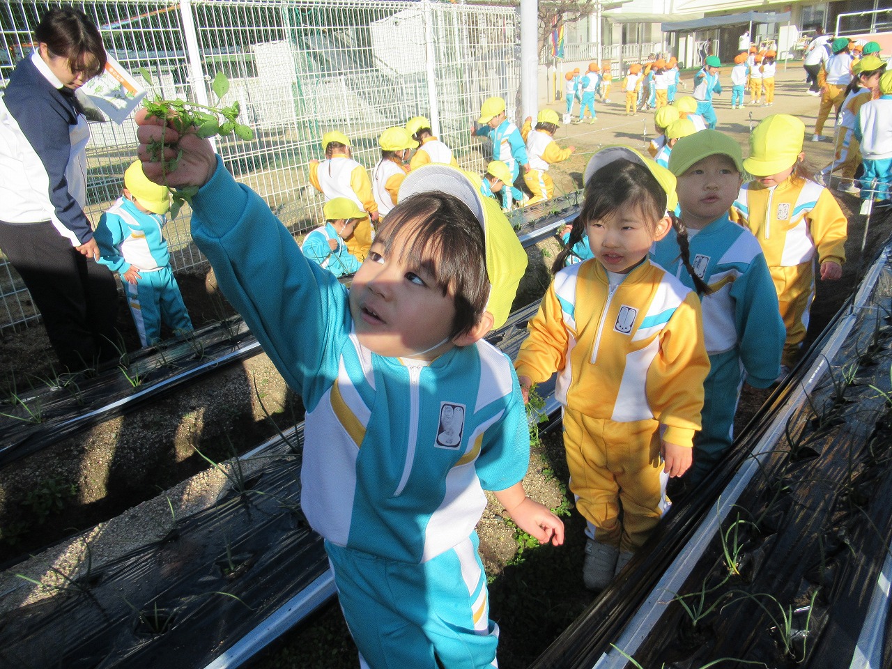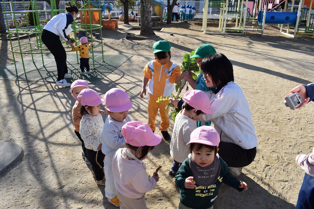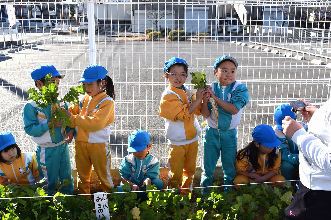みかん組さん、みて。大きなすずしろがとれたよ。