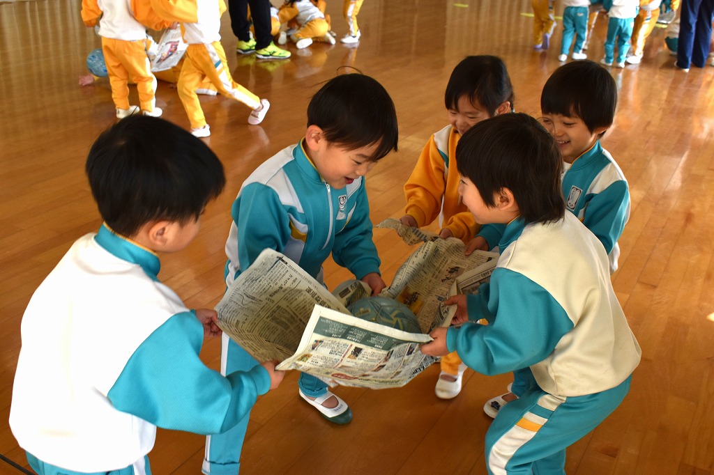 新聞紙でボールを運ぶよ。