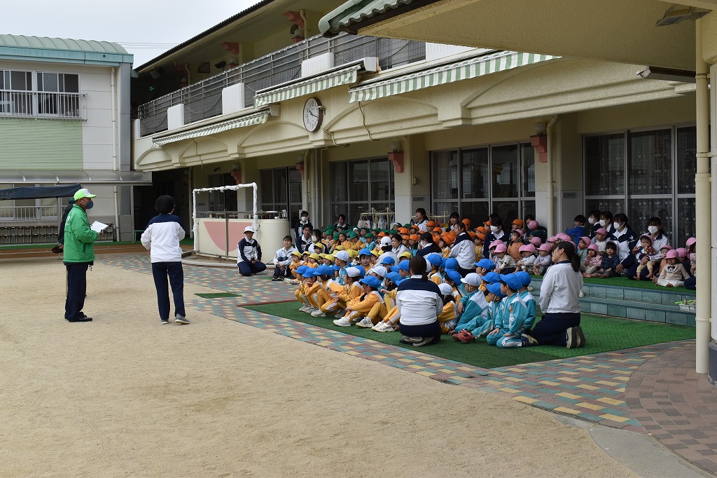 岡山西警察署スクールサポーターの方にご指導ご協力頂き、全園児・職員で不審者訓練を実施しました。