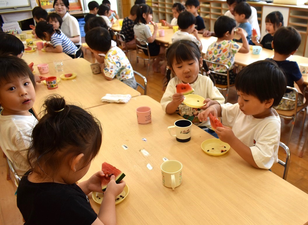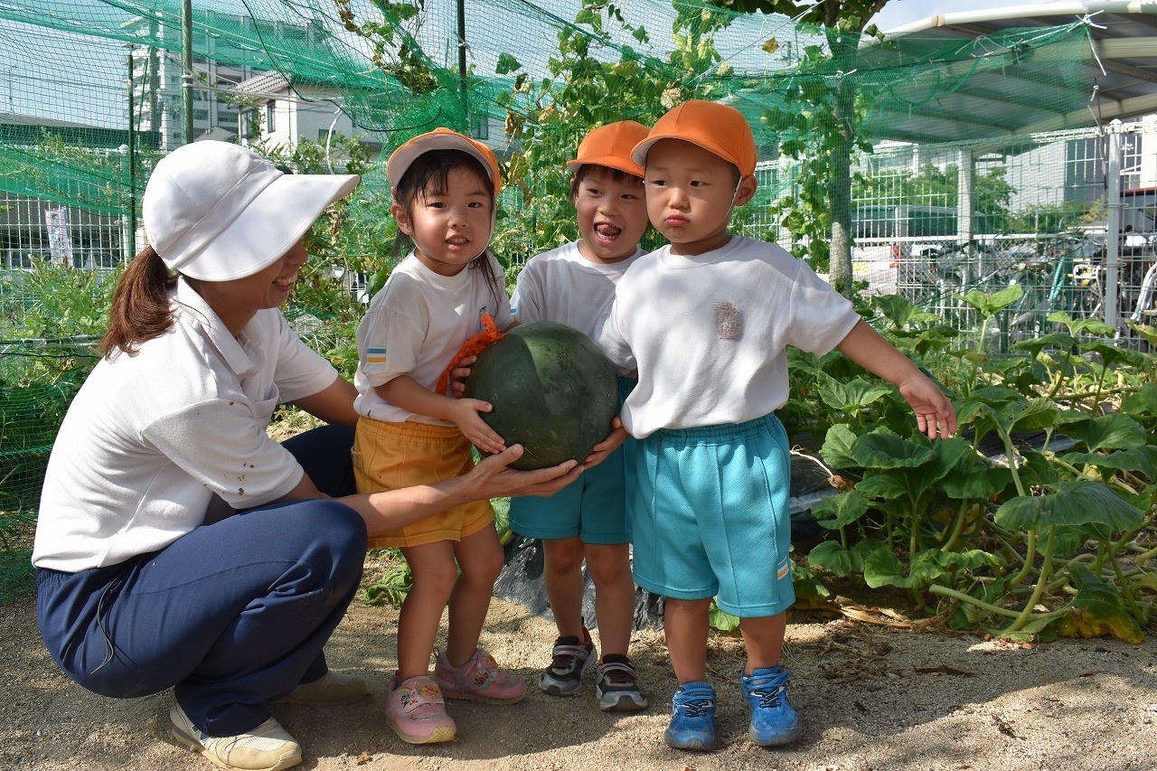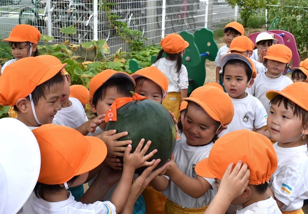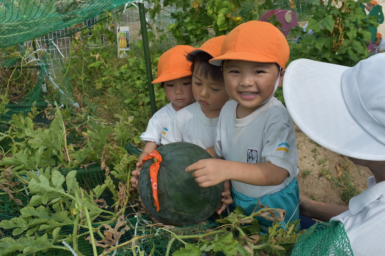みかん組さんに、スイカ収穫のお手伝いをお願いしました。