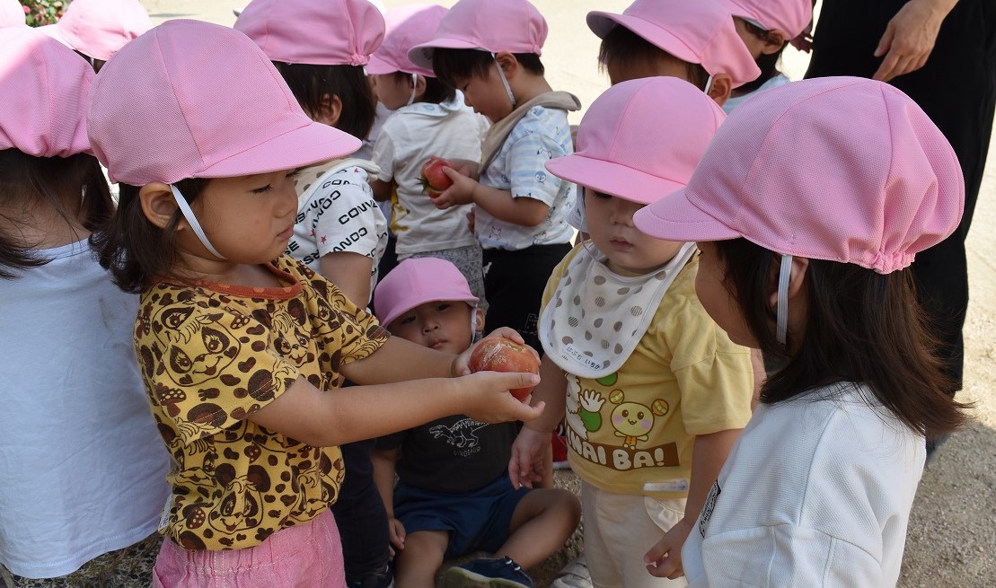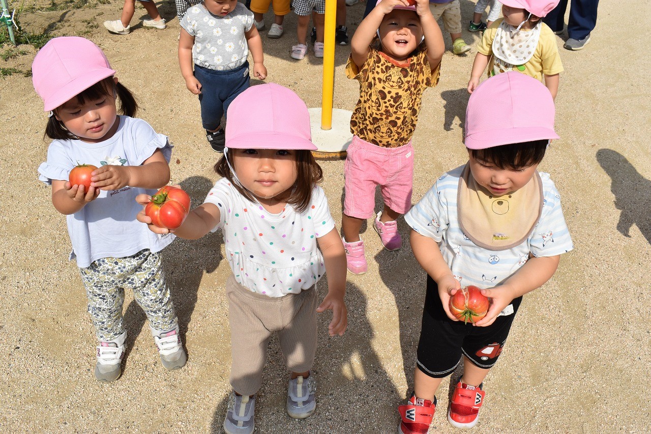 隣の畑では、もも年長さんがトマトを収穫しています。