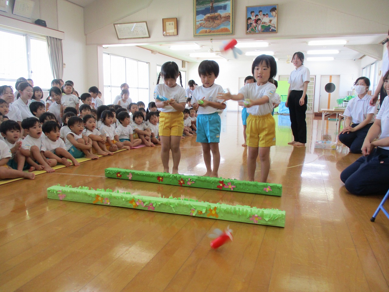 ストロー、トイレットペーパーの芯、牛乳パックで作ったトンボを飛ばして遊んだよ。