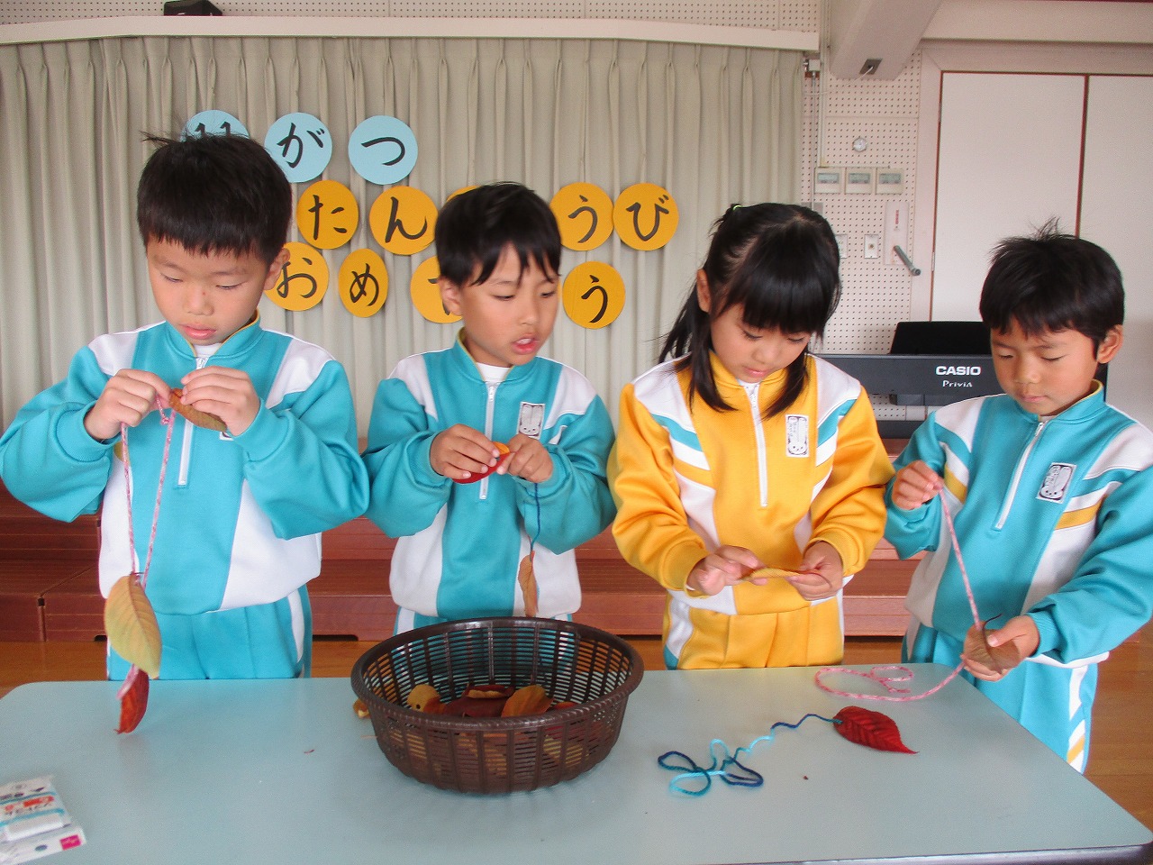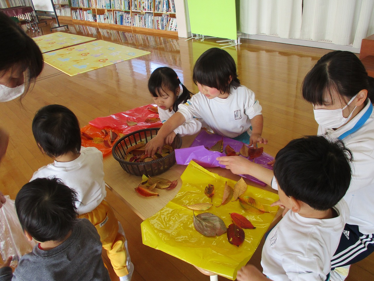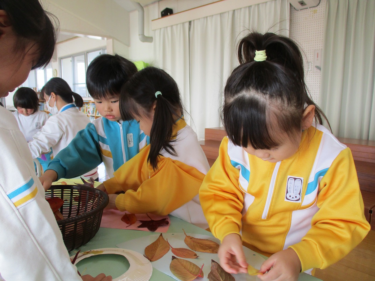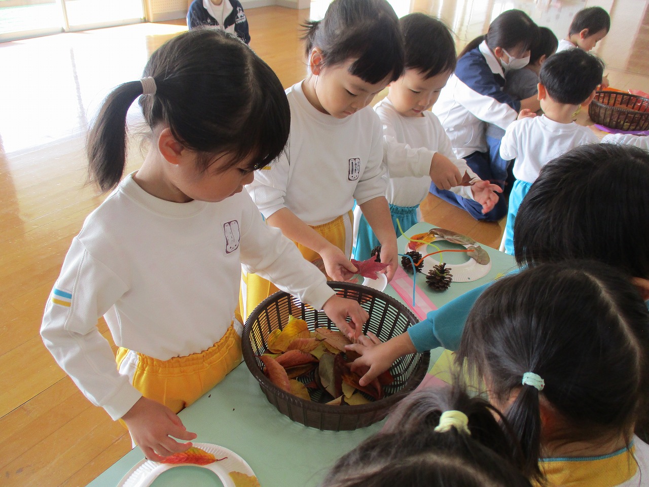 誕生児は短い時間ですが遊戯室に集まり、落ち葉を使った制作をしました。