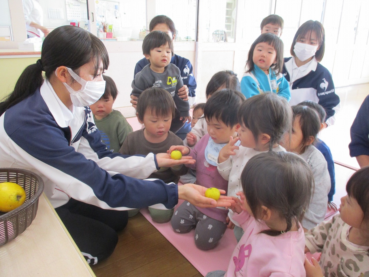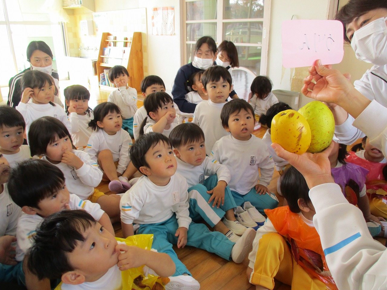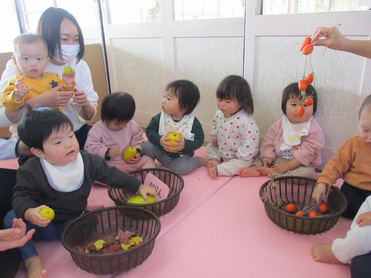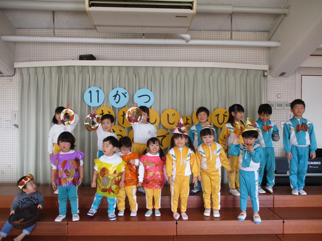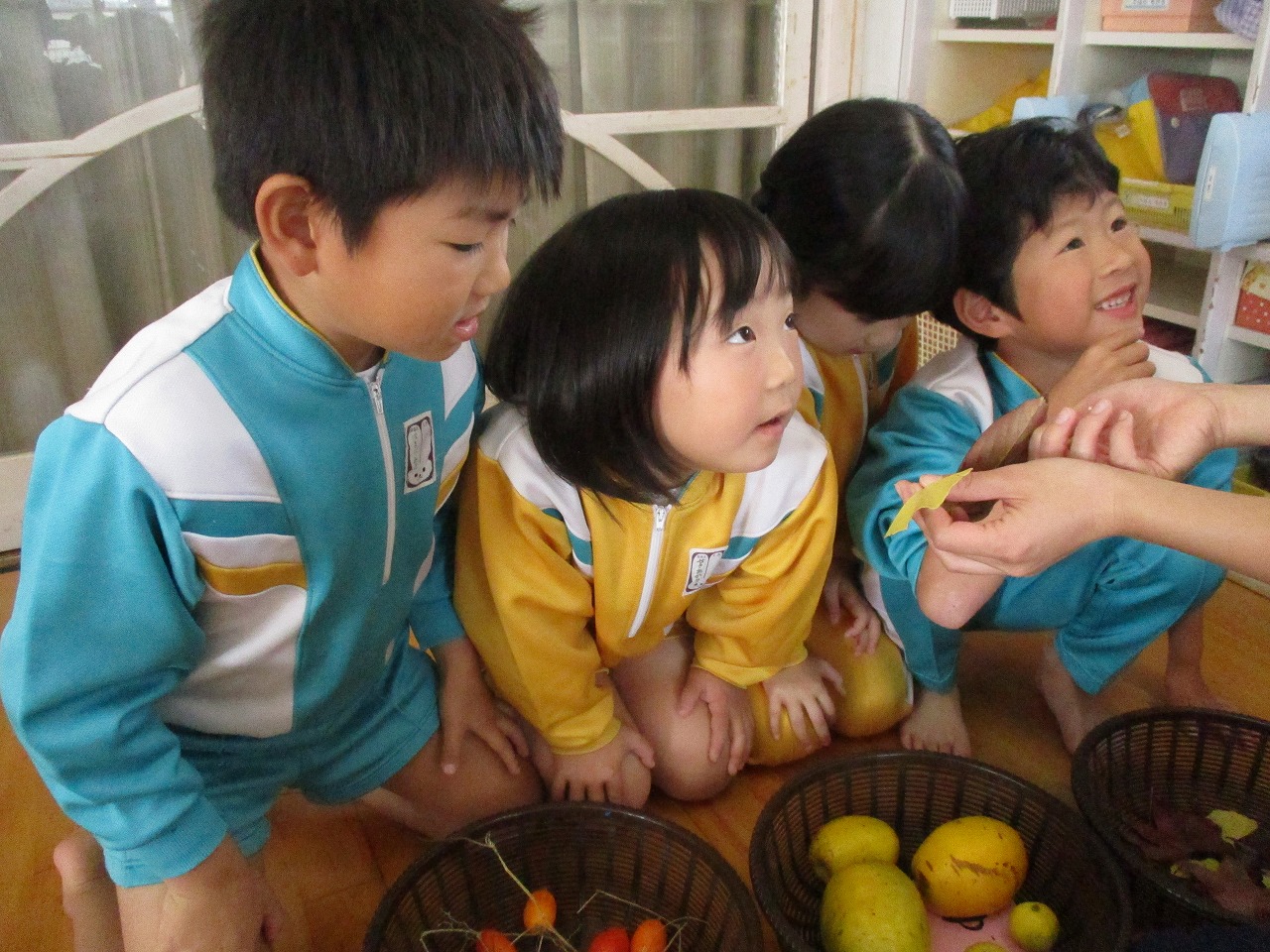 誕生児は短い時間ですが遊戯室に集まり、落ち葉を使った制作をしました。