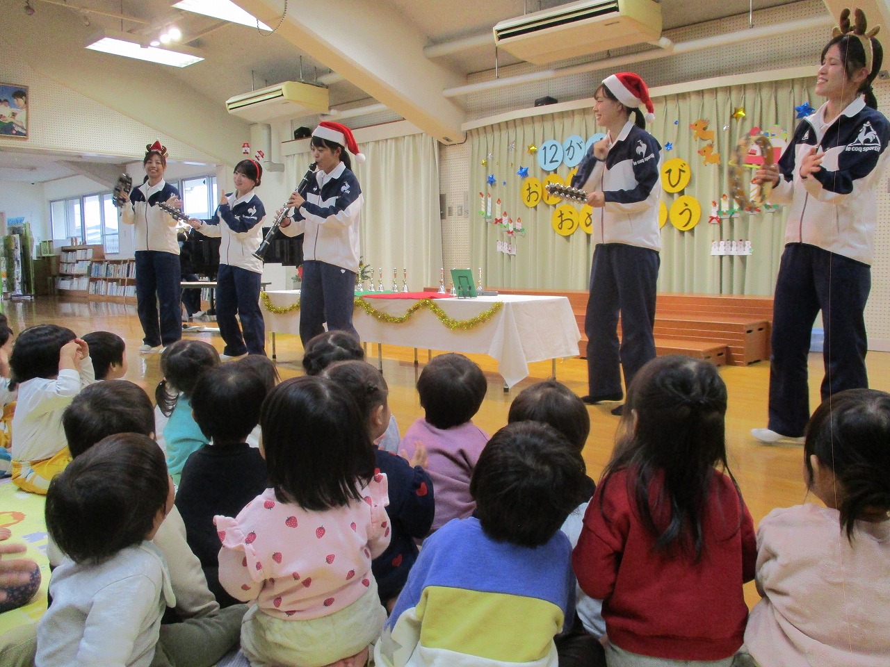 クラリネット、ピアノ、すず、タンバリンを使った合奏にも合わせてみんなで歌い、子どもたちもわくわくです。