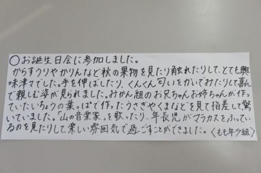 たんじょうかい 一場面を紹介します!!  11月20日(金)  保育テーマ  まっかな秋   岡山 橘今