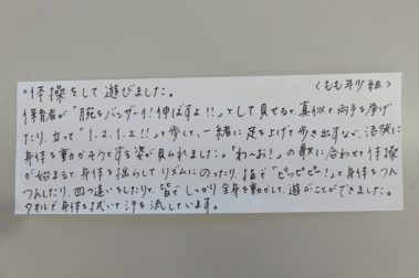 手先、指先あそびをしました。 もも年長(1歳児クラス) 今日の実践を紹介します。担任からのコメントをどうぞご覧ください。 手先、指先あそびをしました。うさぎグループはひも通し、ひよこグループはクリップ(洗濯ばさみのような玩具)を使って遊びました。親指と人差し指の先を使って上手にひもやクリップをつまみ、できたことを保育者に見せてくれたり、「できた!」と教えてくれる姿も見られました。真剣な表情も見られ、一人ひとりが落ち着いて集中して取り組むことができていました。 もも年長(1歳児クラス) 8月31日(水) 保育実践 岡山 橘今保育園