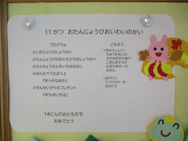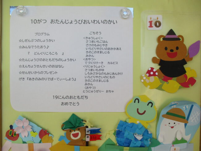 10月のお誕生日会をしました。 キクは黄色、白、紫いろんないろがあってきれいだね。 ケイトウの花は細長かったりボコボコしていたりして面白いね。 &nb…