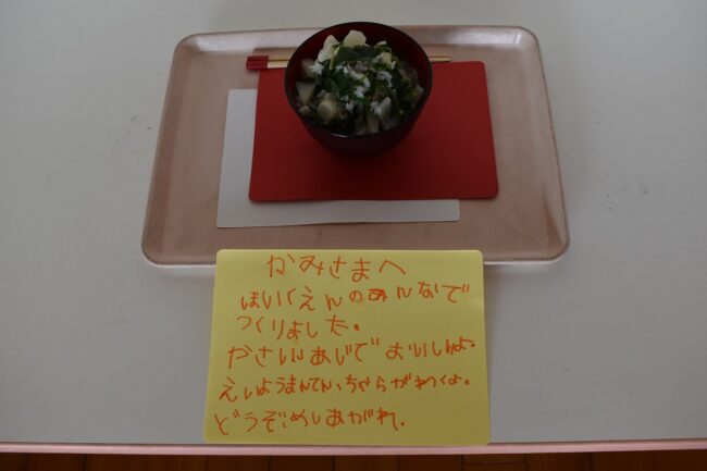 昨日収穫した七草を使って、神様にお供えする七草がゆを作りました。 あじさい組が、丁寧にすずしろを刻みます。 すずしろと米をぐつぐつ炊いていると、遊戯室は甘い香りでいっぱい( *´艸`) 泡やお米が動いているのが見えて、歓…