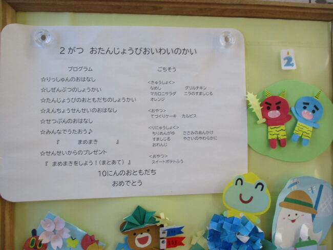 2月の節分・誕生日会をしました。2月生まれの友だち、お誕生日おめでとう! 今月は感染症拡大防止のため、各クラスで行いました。 自然物「木蓮」 フサフサの葉っぱが全部落ちるとお花が咲くんだって。…