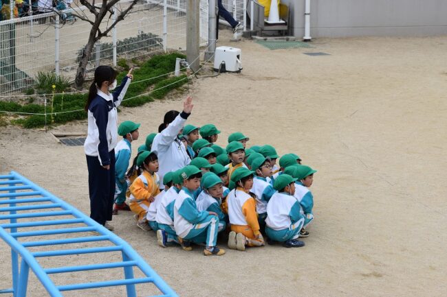 岡山西警察署スクールサポーターの方にご指導ご協力頂き、全園児・職員で不審者訓練を実施しました。 朝、いつものように園庭で遊んでいると、不審な人物がやってきました。 園児が素早く担任の近くに集まります。 クラスに急いで入り…