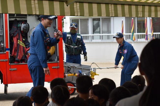 6月中旬に、橘今保育園に消防士さんと消防車が来てくださいました。 あいにくの雨でしたが、たちばなっ子たちは間近で見る消防車に大喜び! 避難訓練を見て頂いたあと、火災についてわかりやすくお話をしてくださいました。 資器材も…
