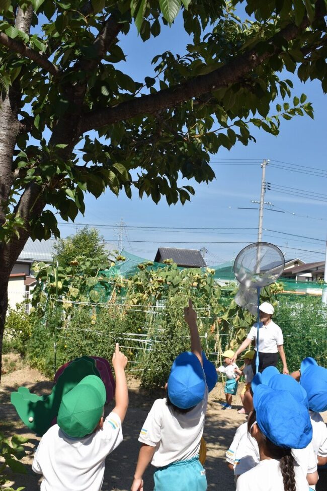 園庭では、朝からセミの大合唱♪ たちばなっ子の夏の楽しみは、何といってもセミとり。 「おおきいのみつけたっ!」 こんなところにもみつけました。 はっさくの葉っぱに、セミの抜け殻が沢山ついている…