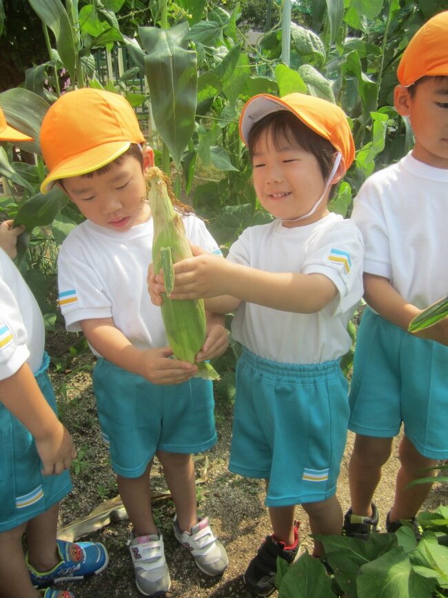 暑い毎日が続いていますが、 園庭のとうもろこしが大きく実りました。 今日は、みかん組、れもん組さんが、収穫をしました。 大きいね! 力を合わせて、ポキッと折って収穫です。 ひげを取って、皮をむきます。「白い…