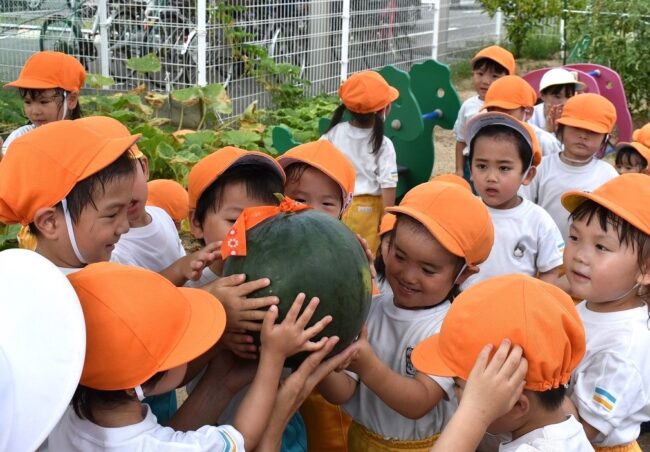 みかん組さんに、スイカ収穫のお手伝いをお願いしました。 子どもたちが畑の奥に進んでいくと、とても大きなスイカがありました! 「よいしょっ」はさみでつるを切ります。 「おもい!」「よいしょ、よいしょ」 ずっしりとしたスイカ…