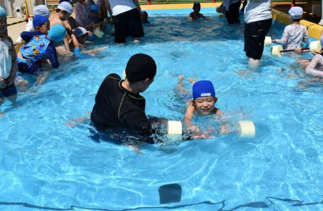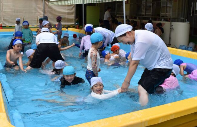 待ちに待ったプール開きの日です。 テラスに集まって、楽しみにしたいことや頑張りたいことを発表したり 皆で準備運動をしたりしました。 もも年少組は、はじめてのプールになれていきます。 もも年長組は、中プールにはじめて入りま…