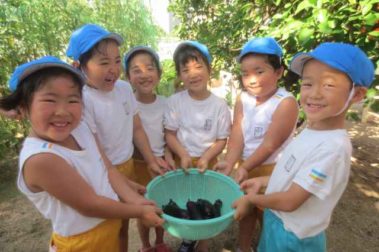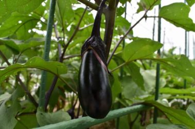 園庭でみんなが育てた夏野菜(なすび、トマ…