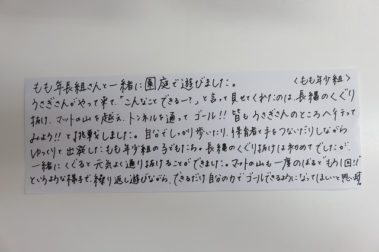 まどか大元(有料老人ホーム)にお住まいの方とお会いし、楽しい時間を過ごすことができました。 あじさい組(5歳児クラス) 今日の実践を紹介します。担任からのコメントをどうぞご覧ください。 まどか大元に行きました。道路の歩き方やまどか大元での過ごし方についてみんなで話し合ってきました。まどか大元では星空サマーコンサートで歌った曲を聞いていただきました。その後、(懐かしの曲!)「ふるさと」を披露。アンコールは、おじいさんおばあさんの隣に行き、一緒に歌いました。はじめは少し緊張する姿も見られましたが、お話をしていくうちに子どもたちの表情から笑顔も見られ、楽しいひと時を過ごすことができました。まどか大元の皆様とどんなお話をしたのでしょうか。 9月21日(水) 保育実践 岡山 橘今保育園