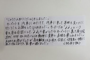 しっぽとりをして遊びました。 もも年長(1歳児クラス) しっぽとりをして遊びました。もも組の子どもたちは、戸外で遊ぶことが嬉しくて、帽子を被ろうとしたり、くつを探して履いたりする姿が見られています。しっぽとりではおさるさんのしっぽをみんあで追いかけて、「まってまって!」と言いながら一生懸命走って楽しむ姿もありました。これからも、天気の良い日にはしっかり身体を動かして遊んでいこうと思います。 もも年長(1歳児クラス) 今日の実践を紹介します。担任からのコメントをどうぞご覧ください。 もも年長(1歳児クラス) 9月7日(水) 保育実践 岡山 橘今保育園