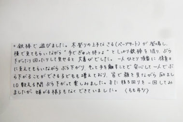 おさるさんと一緒に鉄棒ぶらさがり~  もも年少(0歳児クラス) 9月7日(月)  保育テーマ  ちいさい あき    岡山 橘今保育園