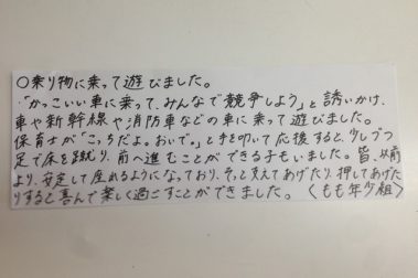 かっこいい車に乗って、みんなで競争しよう もも年少(0歳児クラス) 7月9日(木) 保育テーマ みずのくに ほしのくに 岡山 橘今保育園 保育日誌2015年7月9日 7月・8月の保育 みずのくに ほしの…
